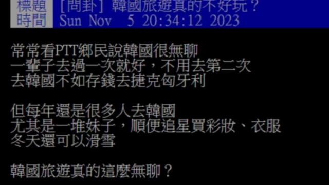 ▼這名網友在PTT發文說,常看鄉民說韓國很無聊,去韓國不如存錢去捷克匈牙利等。他對此很不解,因為每年還是有很多人去韓國,尤其是一堆女生,不僅追星,還會買化妝品、衣服,冬天更是可以享受滑雪樂趣,所以他好奇問「韓國旅遊真的這麼無聊?」
