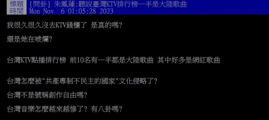 ▼原po在PTT發文說,國台辦發言人朱鳳蓮稱,「聽說台灣KTV排行榜一半是大陸歌曲」。他很久沒有去KTV唱歌,不知道如今的狀況,好奇這是否是真的?「台灣KTV點播排行榜,前10名有一半都是大陸歌曲,其中好多是網紅歌曲」,他不明白台灣不是號稱創作自由嗎?為什麼台灣音樂越來越慘了?