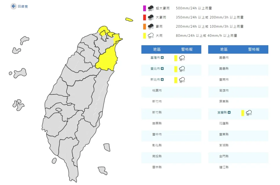 ▼在降雨方面,南方雲系北移,將給北部、東半部、南部地區以及中部山區帶來局部短暫雨,其中基隆北海岸、宜蘭地區和大台北山區的雨勢將較為明顯。氣象署也已對4縣市發布大雨特報。