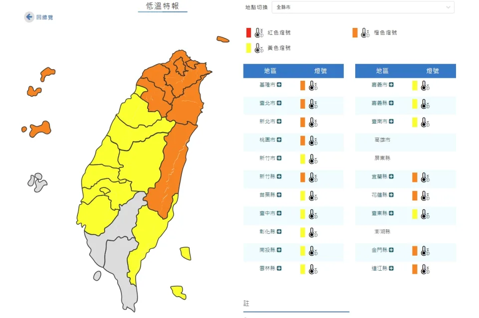 ▼據氣象署的低溫特報,今日至明日新竹以北、宜蘭、花蓮地區及金門將面臨持續10度左右或6度以下的低溫天氣,馬祖地區亦有持續6度左右的低溫(橙色燈號)。低溫橙燈地區包括新北市、桃園市和新竹縣,這些地區有6度以下氣溫發生的可能;而基隆市、台北市、宜蘭縣、花蓮縣和金門縣則有持續10度左右或以下氣溫的可能,連江縣更可能出現持續6度左右或以下的氣溫。此外,新竹市、苗栗縣、台中市等地也將迎來10度以下的低溫。