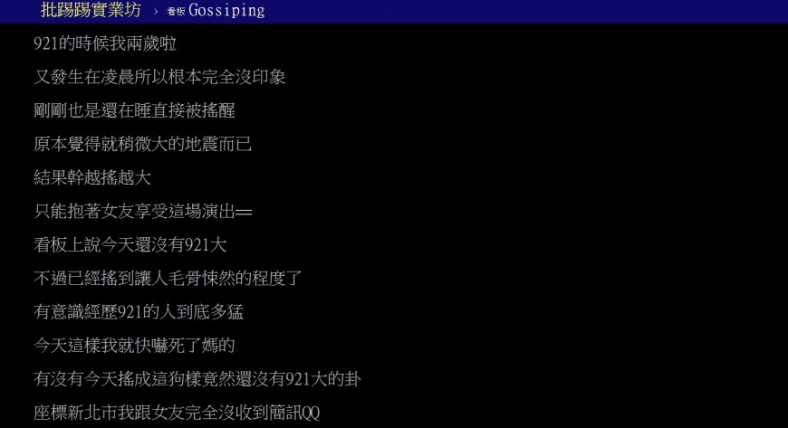 ▼有網友在PTT八卦板上以「搖成這樣還沒有921大?」為題發文說,921大地震發生時他才2歲,事發時正好是凌晨,所以他並沒有太深刻的印象。至於403大地震發生當下,他則是與女友在床上一起被震醒。原po表示,翻看眾多鄉民的討論後發現,雖然他認為403大地震已搖到讓人毛骨悚然,但很多人仍認為403大地震「還沒921大」。