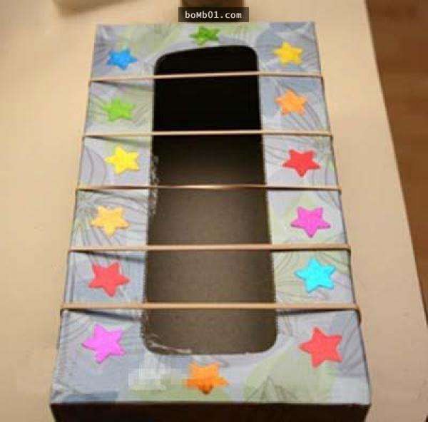 ▼另外也可以這樣做,一樣利用鞋盒和捲筒衛生紙的芯,只是這次裡頭放的不是筆而是電線。