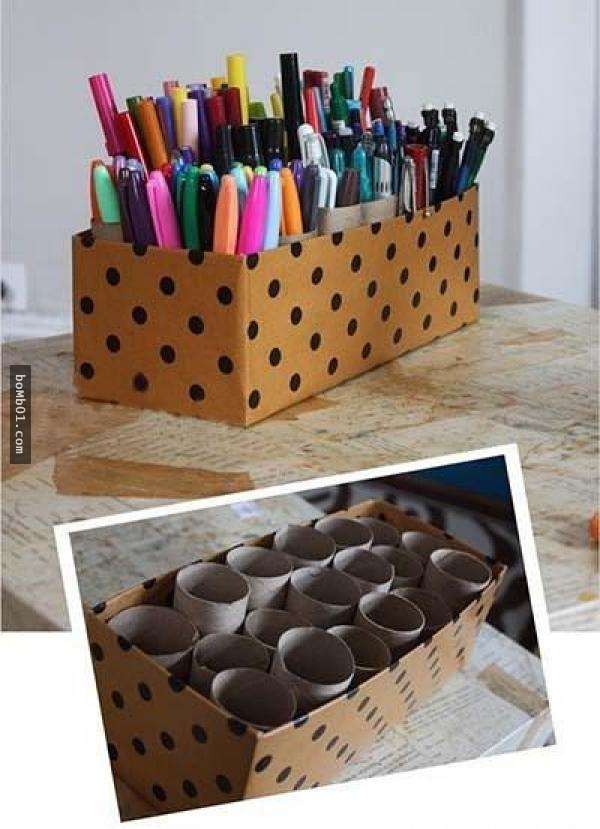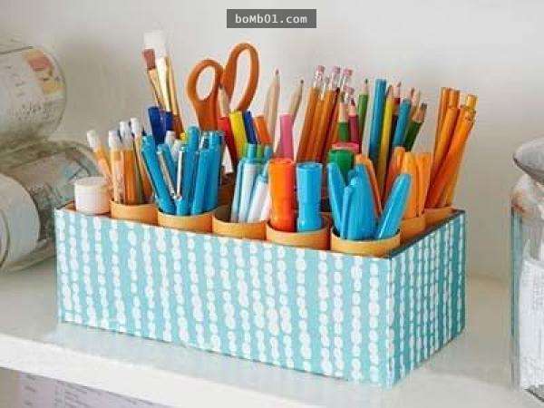 ▼只要在鞋盒裡頭再放進捲筒衛生紙的芯,就能瞬間變成能將不同種類的筆分開收納的超巨大的筆筒囉!