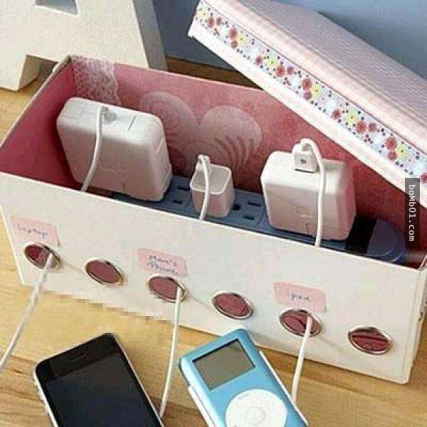 ▼每個人的家裡一定都有某處電線特別凌亂的地方,但是其實只要在鞋盒上挖上幾個電線出孔,就能將電線全都收納在內,讓客廳變得美觀許多!