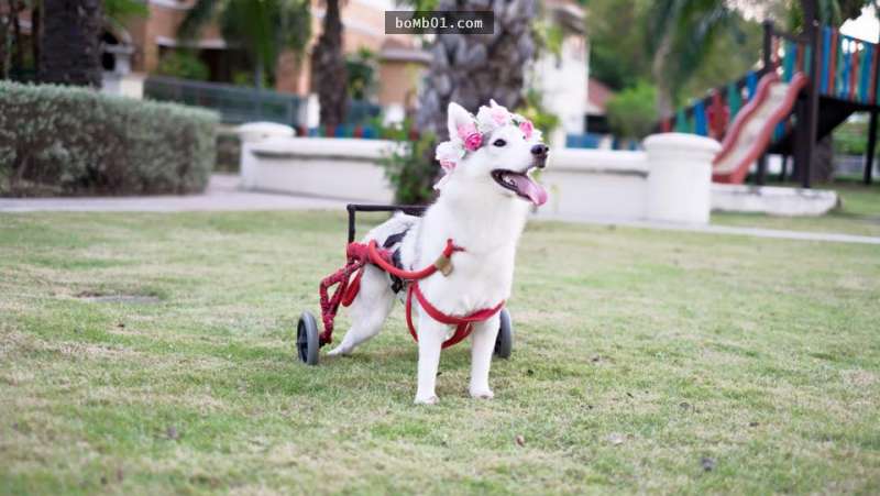 ▼吉也幫Maya 訂製了特別的狗輪椅,支撐Maya的臀部和後肢,讓Maya 可以靠著自己的力量走動。Maya打造了特製小狗輪椅,Maya 一開始對於輪椅還十分困惑,但現在牠已經開心地利用輪椅到處走動、奔跑。