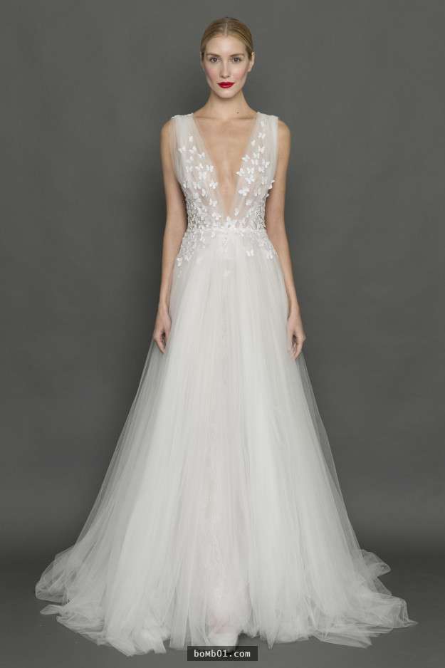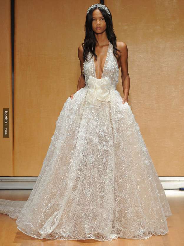 ▼Inbal Dror是以色列的著名品牌,這款深V的婚紗可以充分體現新娘的完美身材,腰間蝴蝶結的設計也是女生的最愛。