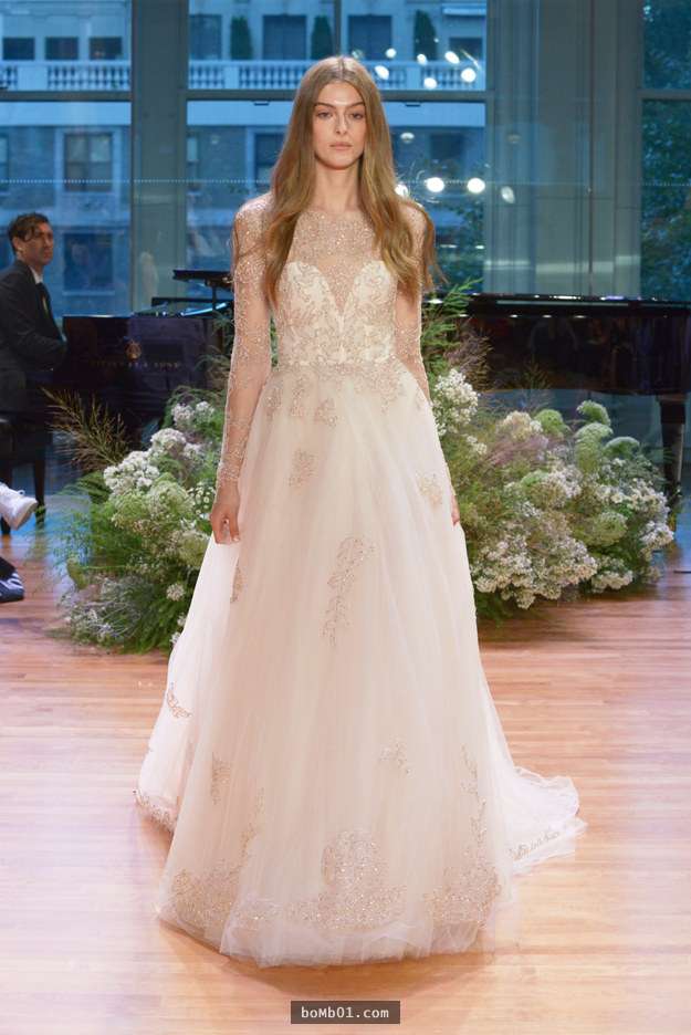 ▼這款長袖的婚紗來自夢尼克路易里爾,胸部的半透視抹胸設計讓保守的新娘也可以充滿性感。
