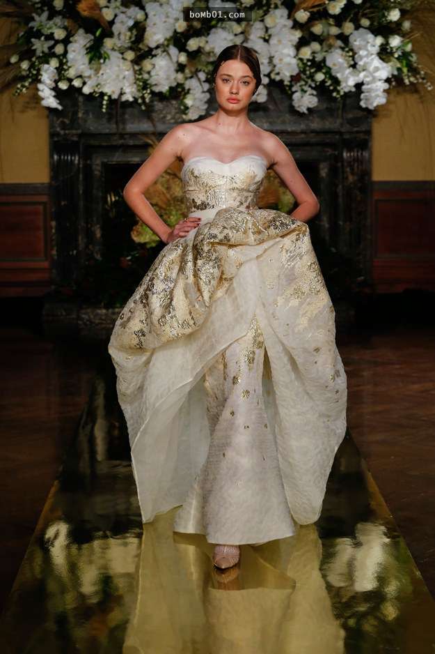 ▼西班牙Yolan Cris推出了金色的婚紗,層次感的設計和金色的繡花充滿了富貴的氣息。