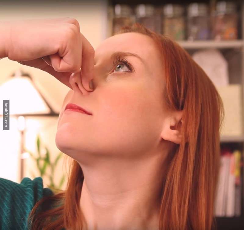 ▼大家可以先深吸一口氣,然後把頭部往後仰,用手指捏住鼻子屏住呼吸。接下來,盡可能忍住憋氣,直到你再也無法忍受才把氣吐出來,這樣一來,鼻子立馬就不塞了。