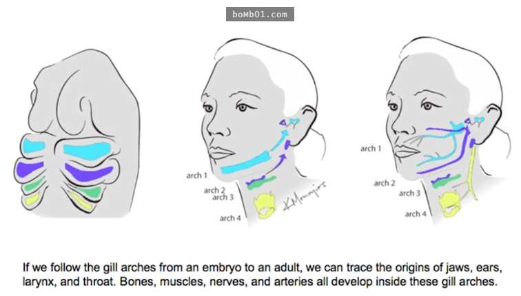 ▼「耳前廔管」從胚胎時期就出現了。胎兒發育時,形成耳廓的第一、二腮弓融合不全,或者第一腮溝封閉不全,就會出現這樣的情況。從皮膚表面看,它只是一個小洞,其實裡面很複雜,甚至能夠直接穿過耳輪腳或耳廓軟骨,深入顱內。生物學家Neil Shubin曾表示,「耳前廔管」可能是「魚鰓進化的殘餘」。