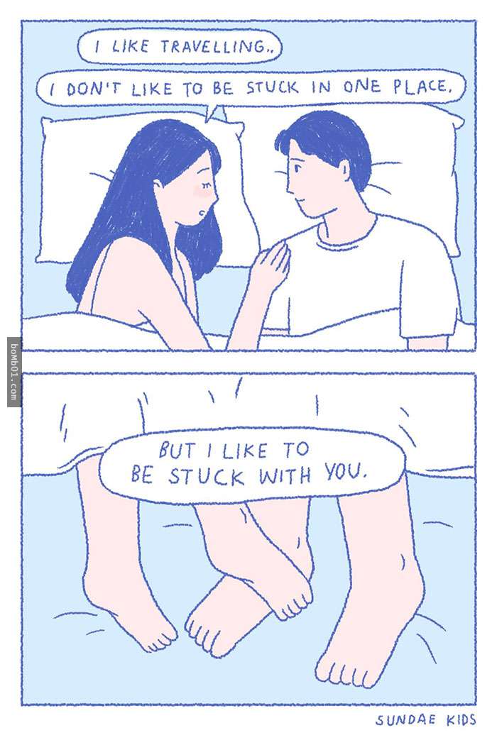 ▼8. 女:我喜歡旅行,不喜歡被困在一個地方。但跟你在一起的話,被困住也不錯。