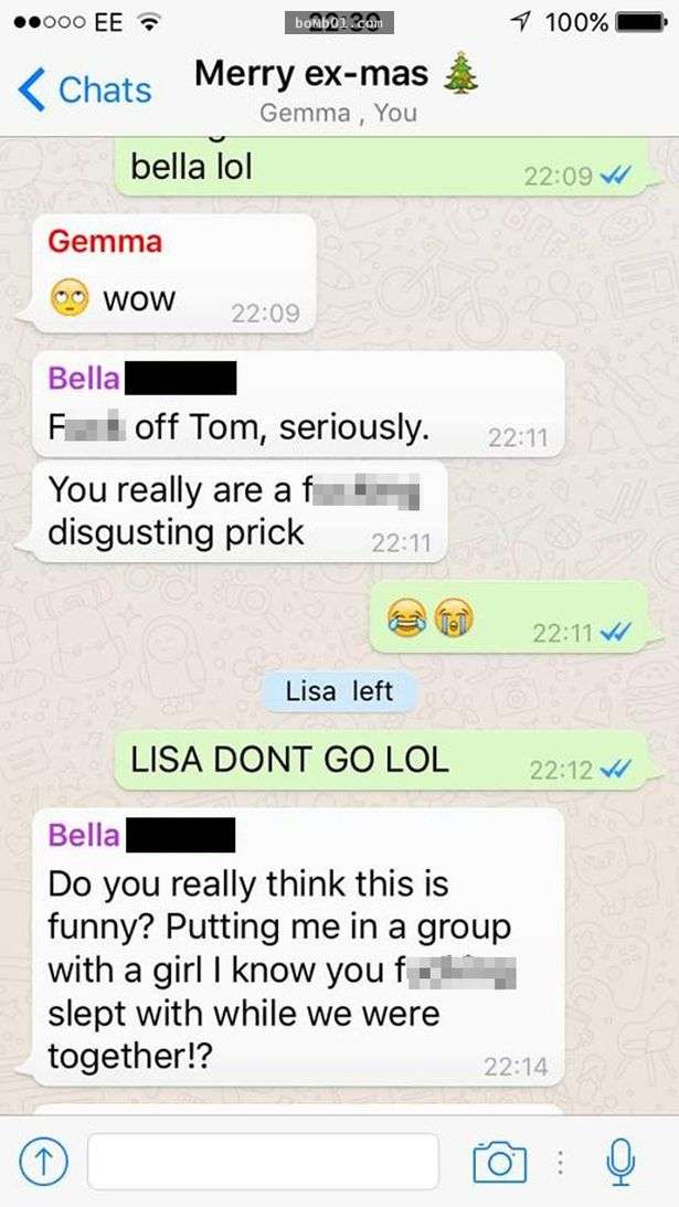 Bella:你真覺得這樣很好玩嗎?把我拉進這個群組,裡面還有一個我們在一起時你和她睡過的女人?!