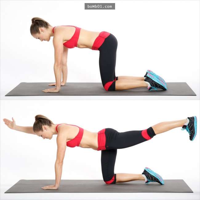 先將四肢撐地成OTL型,然後使用一隻腿和一隻手做伸展的動作,伸展的時候別忘了使出吃奶的力氣伸直!