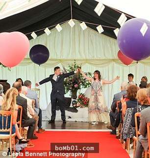 ▼婚禮現場有很多彩色氣球、鮮豔旗子,Polly穿著美麗的白紗,上面還有複雜精緻的圖案。