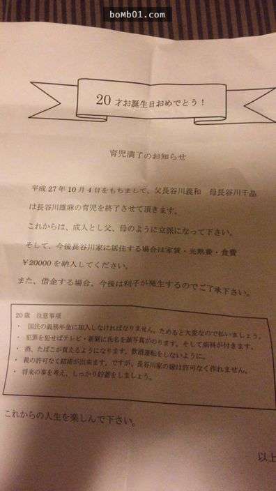 這對有趣的父母親還附上了「20歲注意事項」,包括要繳國民年金,還警告他滿20歲後,如果有犯罪的話,「電視台報導的時候是不會打馬賽克的」。父母也告誡他雖然可以買菸買酒,但不能酒駕。婚姻方面,父母容許他「先斬後奏」,但女方是否能成為長谷川家的媳婦,可就另當別論了。最後更提醒「要考慮將來的事,趕快好好存錢」。