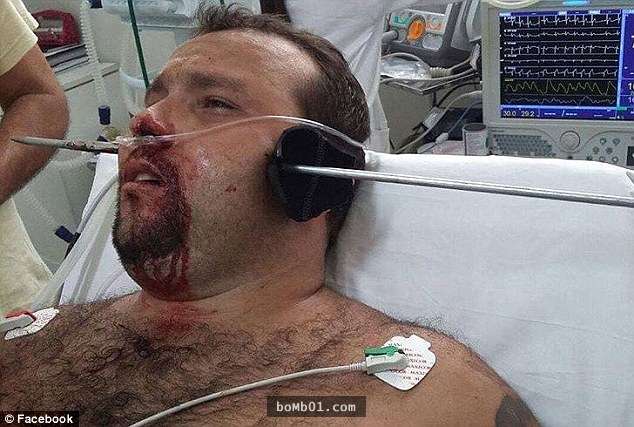 ▼金屬長矛從他的臉頰一側穿過,從另一側刺了出來。他口鼻流血被送到醫院,看起來非常痛苦。