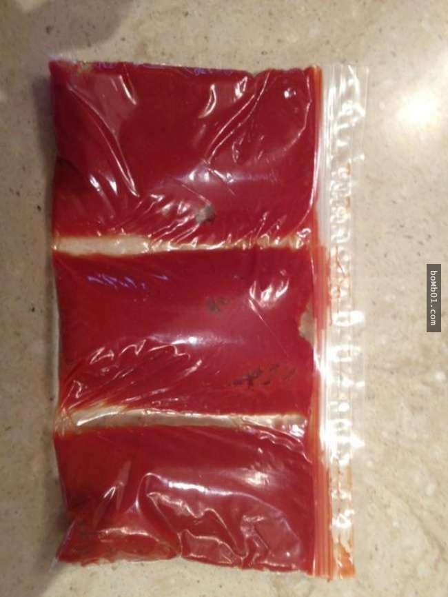 ▼把剩下的醬料倒進存儲袋中,再放入冰箱中冷凍,大概一個小時後取出切成小塊,以後使用可以酌量添加。