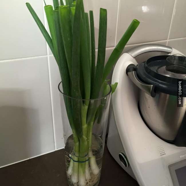 ▼把大蔥插進水裡保存,每次用時剪下一截,它還會繼續生長。