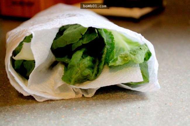 ▼用紙巾包裹生菜葉,能夠保鮮一週左右。多餘的水分會滲入紙巾中,生菜不會枯萎。