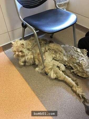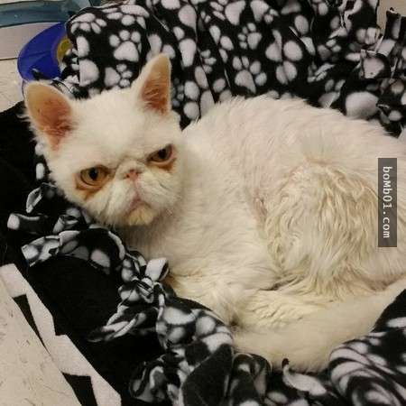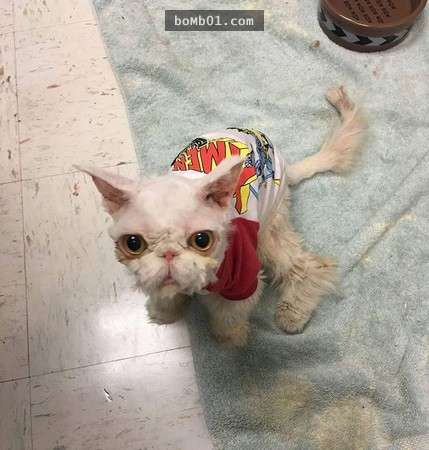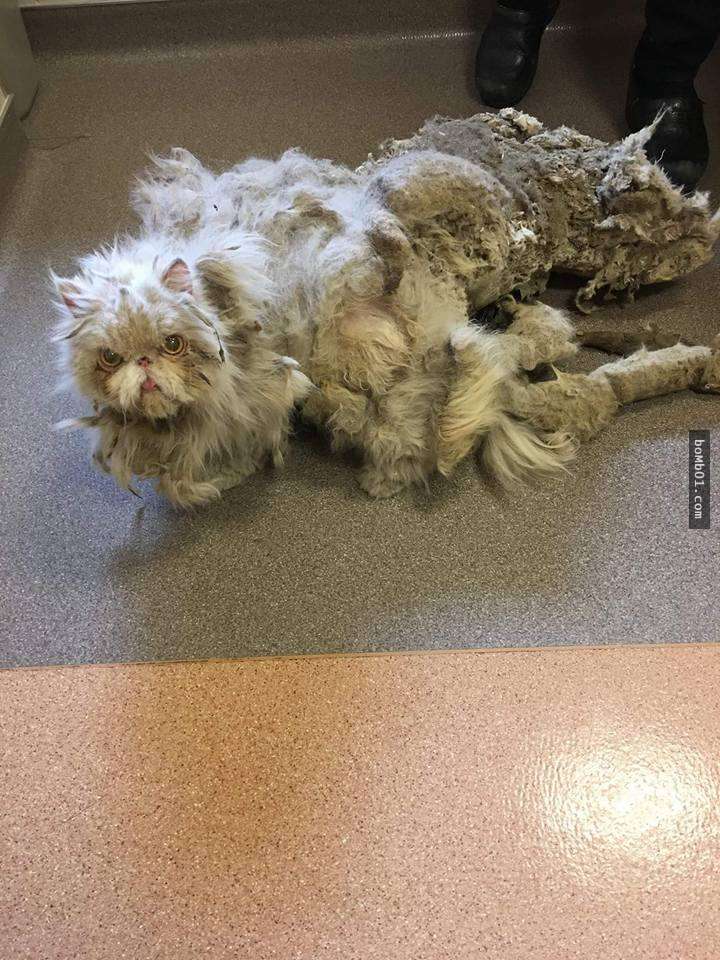 ▼收容所的志工發現牠時,牠的身體非常虛弱。2.3公斤重的凌亂毛髮阻礙了牠的行動,牠連走路都很困難,體重更是只有普通波斯貓的一半。