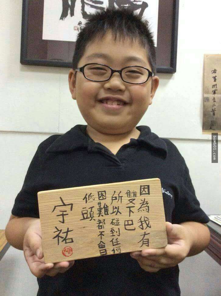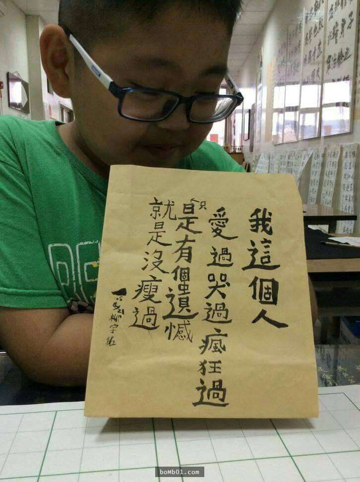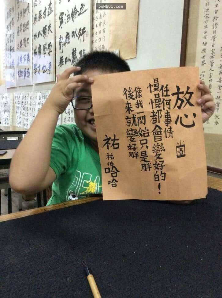 2017年01月14日每個人在世界是都是「不完美」的存在,但學會如何去樂觀看待自己本身擁有的特點,就是一件人生中相當重要的課題。一位10歲的柳姓小弟就在上書法課時,以毛筆寫下許多逗趣的字句,配上他爽朗樂觀的笑容,讓人看了覺得超級療癒啊~