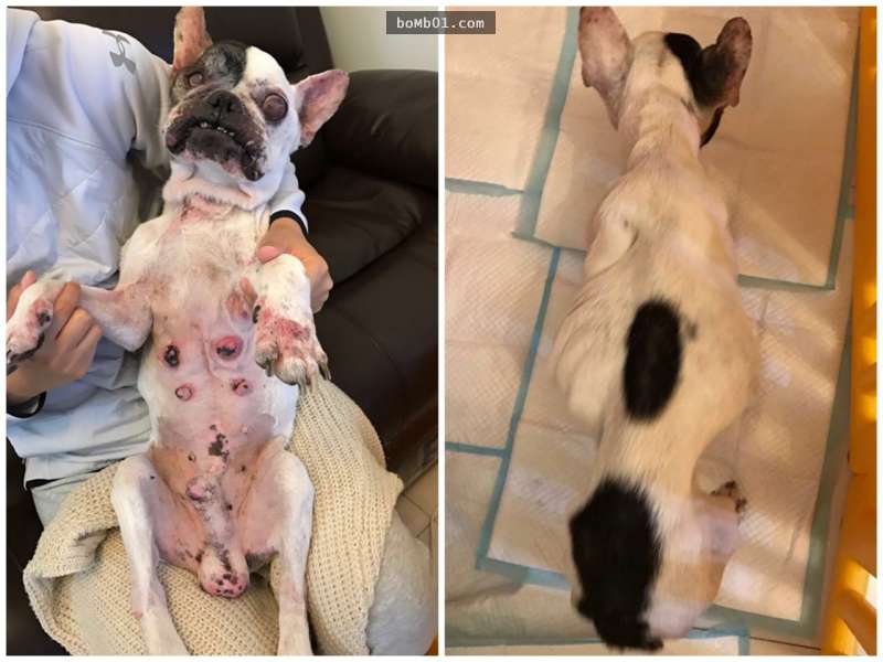▼更不幸的是,這隻法鬥雙眼失明,毫無安全感。而且牠的肺部腫的像球,爪子紅腫潰爛,這些都急需治療。