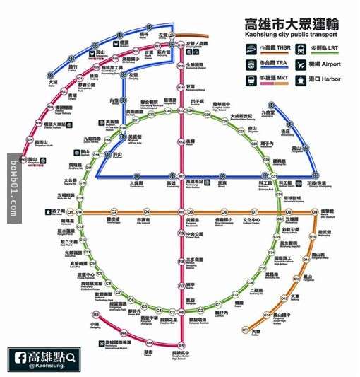 ▼粉絲頁《高雄點》也分享了一張自製的路線圖,這張圖集捷運、台鐵、高鐵、輕軌等路線圖於一身,呈現同心圓狀,讓原本錯綜複雜的交通車網一幕瞭然。