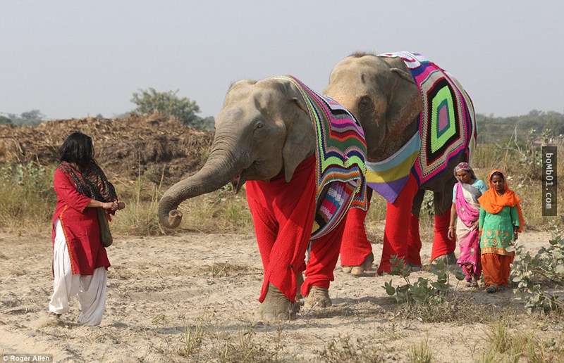 ▼這些五彩斑斕的大號毛衣整個蓋住大象的身體和腿,能夠給牠們一些幫助。