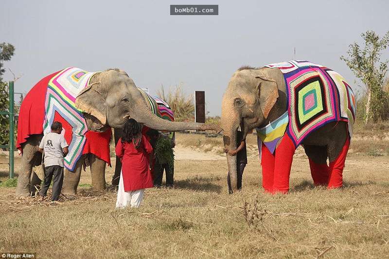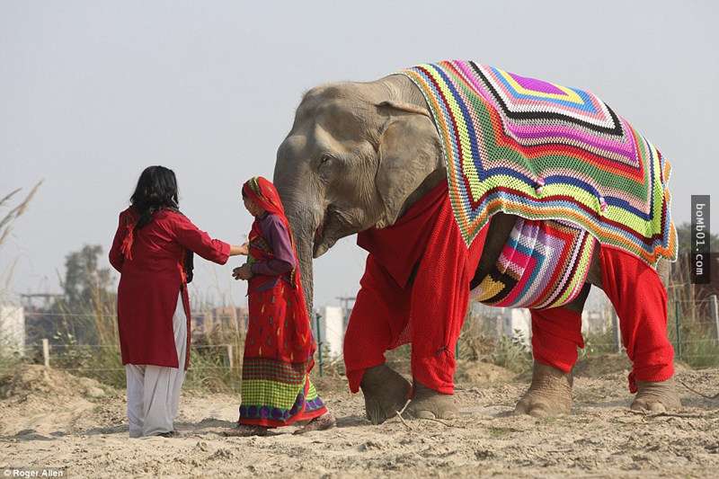 ▼當地夜間氣溫會下降到零度左右,附近村子裡的女士們為了幫助大象禦寒,為牠們編織了一些大號毛衣。