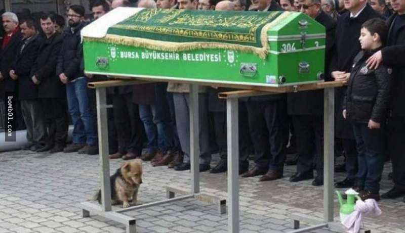 ▼葬禮上,一群人抬著Mehmet的棺材到清真寺舉行儀式,虛弱的Cesur堅持走在最前面。牠默默坐在棺材前,低著頭,眼睛裡一片哀桑。