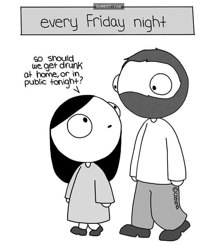 女友:「所以我們今天要在家裡喝醉還是在公共場所喝醉?」