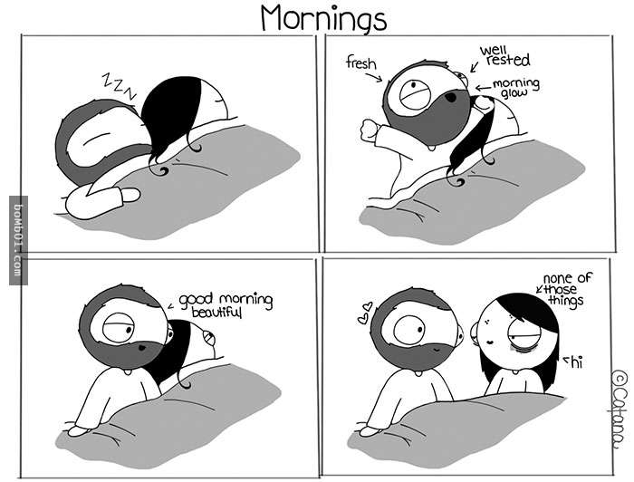 男友精神飽滿的起床:「早安美女。」蓬頭垢面的女生:(其實一點也不美)
