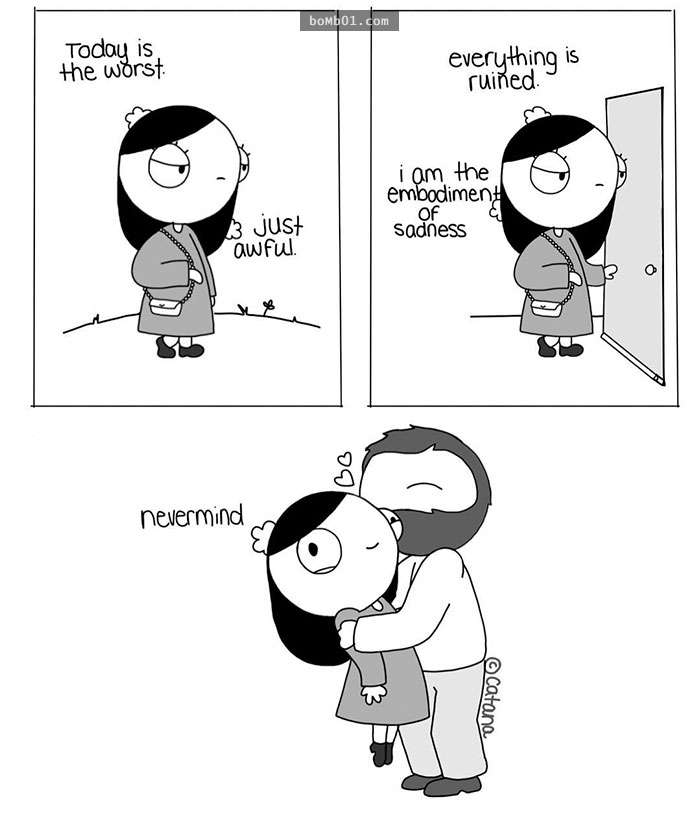 ▼1.女友:「今天超慘的!」「每件事情都毀了。」「悲傷就是我的人生代名詞。」給男友抱抱後… 「當我沒說~」