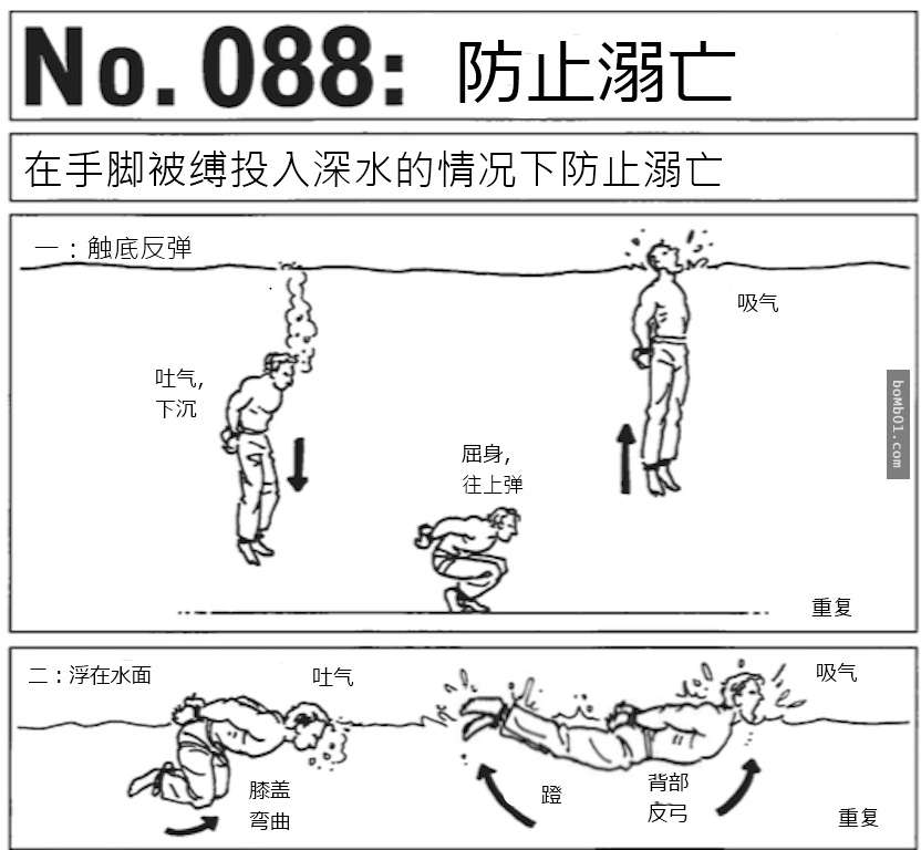 ▼手腳都被綁住時被丟入水中可能會給呼吸造成困難,但是可以經由調整自己的身體姿勢。在淺水處採用下沉再反彈的辦法往岸邊游,讓身體下沉踩到海底或湖底再反彈到水面上呼吸空氣。