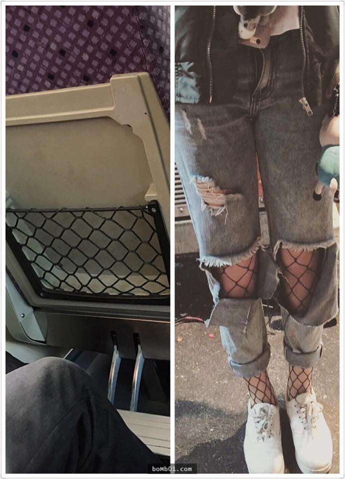 ▼不久前,一名女網友在爆廢公社發文,稱自己最近穿著這種組合搭火車,卻被後座的弟弟笑。那個弟弟驚奇指著火車椅背上的網兜對媽媽說:「媽媽你看,姊姊腳上跟那個一樣!」