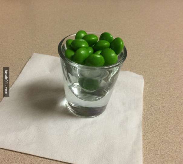 ▼他最喜歡綠色,女兒也知道這一點,所以專門準備了這個等他下班。(挑過的M&M巧克力)