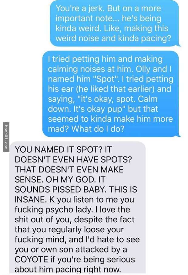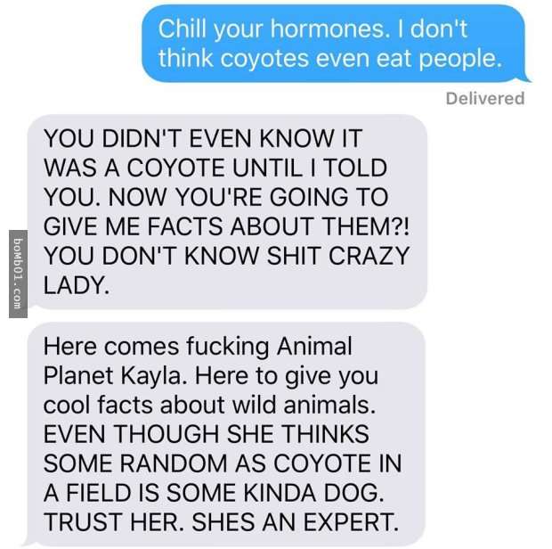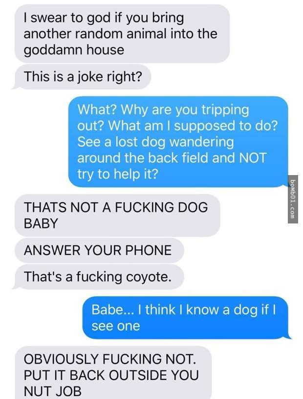 ▼凱拉說:「冷靜點,不管牠是什麼,賈斯汀。我喜歡牠,牠很可愛,我想要飼養牠。」丈夫說:「妳不能養一隻野狼,沒人這麼做。」凱拉回:「不要在訊息裡罵我了啦,你根本是不講道理在亂發脾氣啊!」丈夫說:「我不講道理?!我的屋子裡有一隻野狼,但我的女人卻把牠當作一隻吉娃娃在對待,妳才是喪心病狂!」