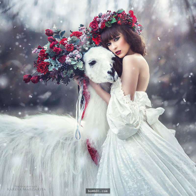 ▼雪花、野生動物、精緻複雜的服裝、顏色鮮豔的道具……這些都讓Margarita的作品有了不一樣的感覺。