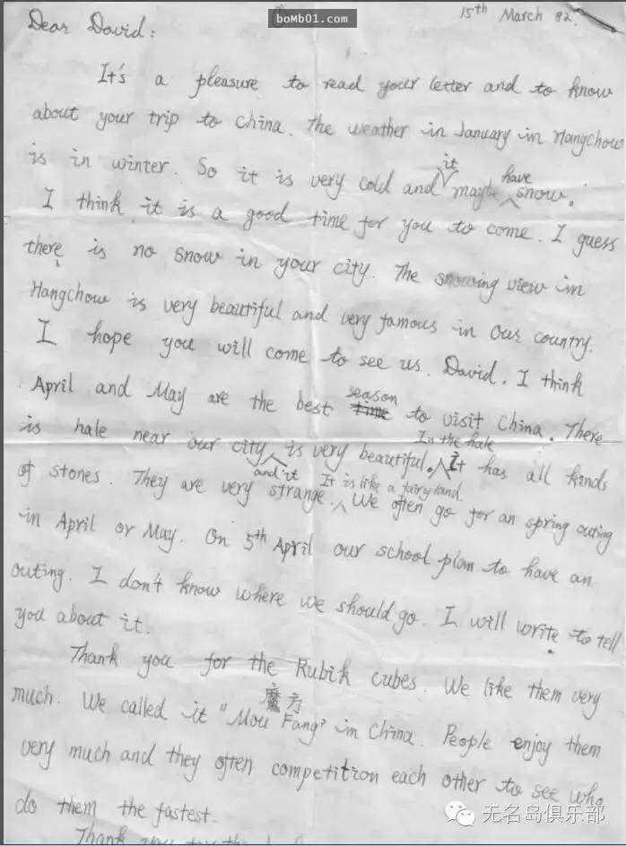 ▼就這樣,馬雲與大衛成了筆友。他也經常跟肯通信,還在信中稱他為 「父親」。肯非常喜歡這個孩子,會認真糾正他在信中的錯誤,並建議他加大字距,這樣就能把糾正寫在空白處。