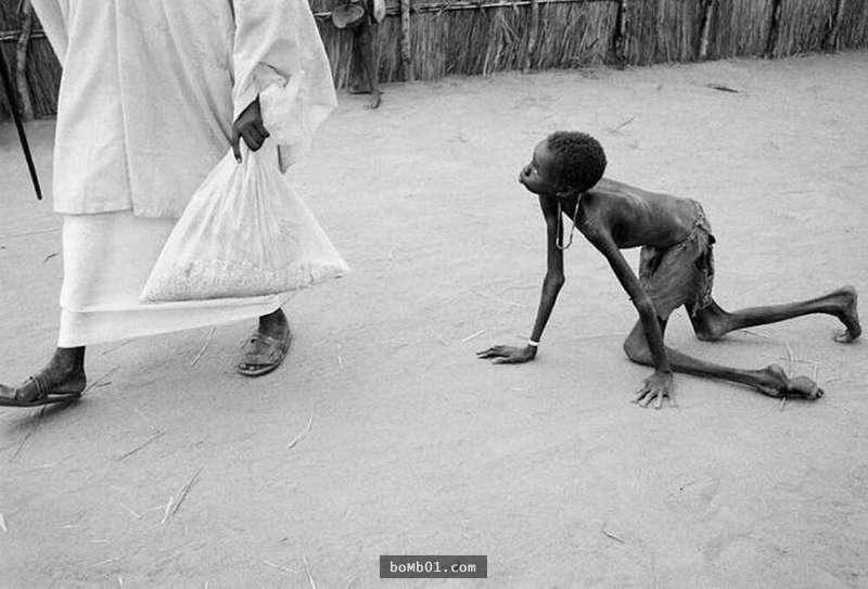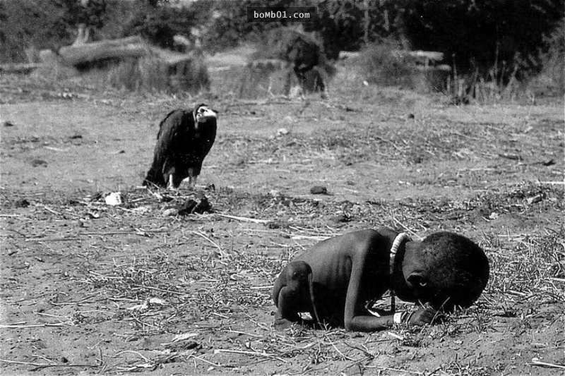 ▼7.飢餓的小孩:這名小孩想要去分發食物的地方找東西吃,但他太虛弱,根本爬不起來,後面的禿鷲虎視眈眈,似乎想要吃掉他。拍攝照片的Kevin Carter後來趕走了禿鷲,看著孩子到達糧食供應處,不過因為條件有限,他無法將孩子帶走。照片公開後他被外界批評,最後自殺。