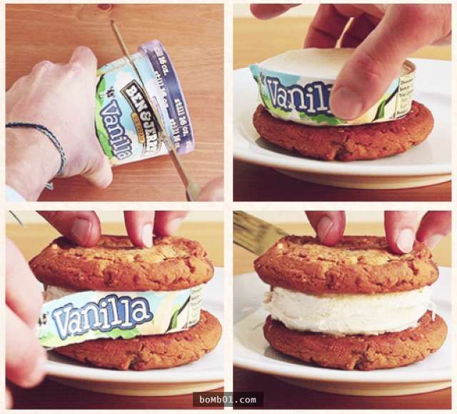 ▼7.把冰桶用刀子切成薄片裝,再用兩片餅乾夾起來,就變成好吃的自家製冰淇淋三明治!