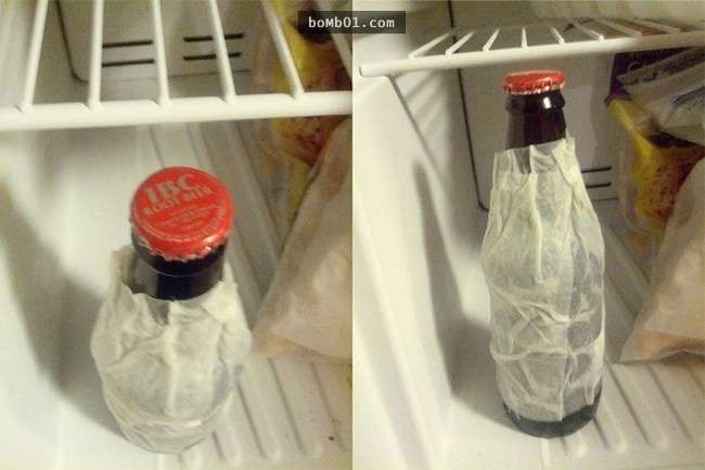 ▼5.想要快速喝到一瓶冰冰涼涼的飲料,可以把飲料包在濕紙巾中冰到冰箱裡,等待15分鐘就可以了。