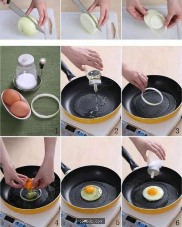▼2.將蛋打在洋蔥圈中,就能夠做出完美的圓形荷包蛋。