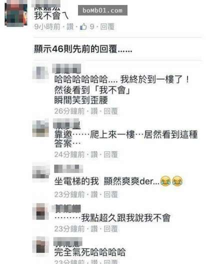 ▼不過最令人笑噴的是,不少網友都留言表示1樓網友根本「神回覆」,逗得許多人都好奇得一直爬文。結果好不容易爬過2千多個留言,來到1樓查看時,卻發現…1樓的神網友是回覆「我不會ㄟ」,讓網友整個崩潰直呼「爬上來一樓居然看到這種答案」、「我點超久跟我說「我不會」!」、「哈哈哈哈,我終於到一樓了,瞬間笑到歪腰」,完全被氣到哭笑不得啊!