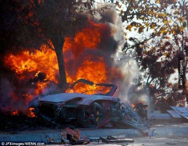 ▼不久後,這部紅色保時捷Carrera GT就撞到了電線桿和樹上,車子迅速起火燃燒,車上的人也永遠離開了這個世界。