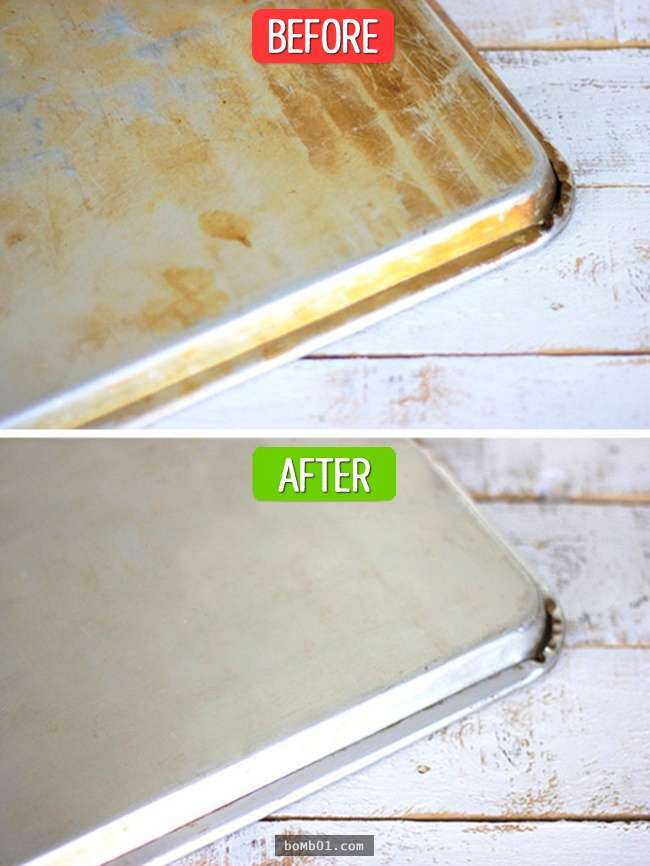 將含有雙氧水和蘇打粉的麵粉放在有焦痕的烤盤上30分鐘,在稍微清洗一下就可以去除焦痕。