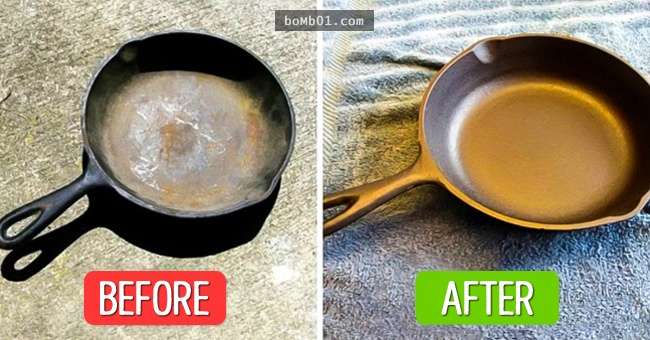 你需要準備可以用在鍋爐上的消毒劑、手套、垃圾袋以及白醋。首先把消毒劑噴灑在鑄鐵鍋上,再將鍋子用垃圾袋緊緊包住確保它不乾掉。就這樣放置鍋子一到兩天後,再把消毒劑洗淨。然後再重複一次以上的步驟後,用熱水將消毒水洗淨。將鍋子放置在醋和水1:1的混合液體中一個小時,再用棕刷將鍋子刷乾淨,事後將鍋子風乾。把烤箱調到250度,然後把鍋子放在裡面一個小時。小心地拿出鍋子後,在鍋子表面上塗滿橄欖油,熱化的金屬會吸收油份,然後就可以把鍋子上的殘留物擦除乾淨了,最後再將鍋子放到烤箱中一次,只是記得要把鍋子反過來放。上述步驟需要重複兩次。