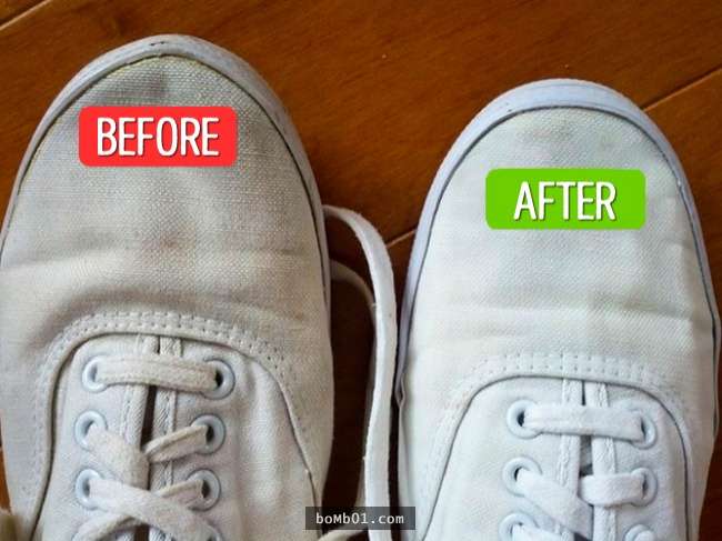 只要用一茶匙的洗碗精清潔劑、三茶匙雙氧水加上兩茶匙小蘇打粉就能讓白球鞋看起來潔白如新。