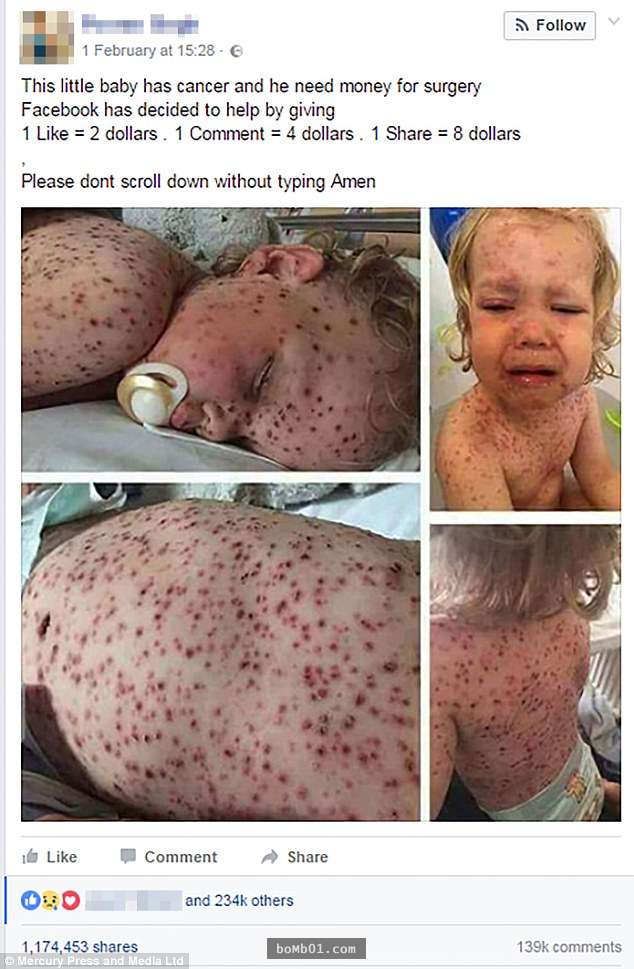 ▼那個騙子在臉書發文表示:「這個小男孩罹患癌症,需要錢做手術。臉書決定提供幫助。一個讚捐2美元,1條評論捐4美元,分享一次捐8美元。」