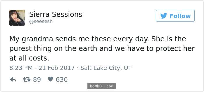 Sierra的奶奶很幽默,也懂得表達自己的感情,讓人非常羨慕。你的奶奶也許玩不轉智慧手機,也不會自拍,更不會每天說愛你,但她對你的愛與思念一點都不會減少。有時間回去看看奶奶吧,她真的很渴望你的陪伴!